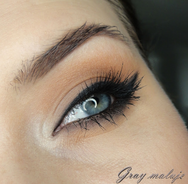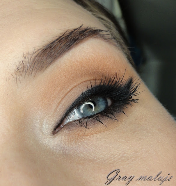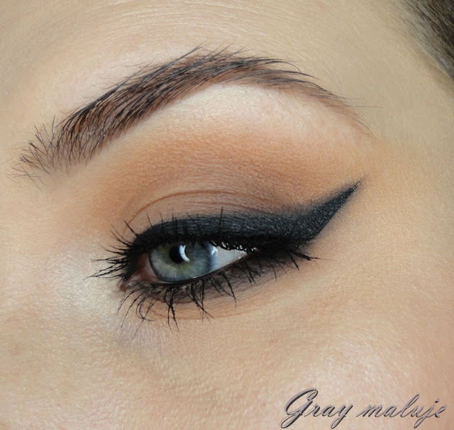 Nie chciałam by było nudno, postarałam się więc sprawić, by makijaż zyskał odrobinę pazura... I pazurów wyszło sporo, bo w efekcie powstało kocie oko. Powieki przydymiłam mieszanką brązu i beżu, zaszalałam z z czarną kreską, którą mocno pociągnęłam w bok, do skroni, następnie przydymiłam ją lekko ciemnym grafitem (czy też lekką czernią). Oczywiście przy takim makijażu warto przyczernić linię wodną czarną kredką lub kajalem oraz postawić na subtelne usta i policzki. Niemniej jednak, makijaż to w dalszym ciągu zabawa, więc cóż - możecie robić co chcecie! :D